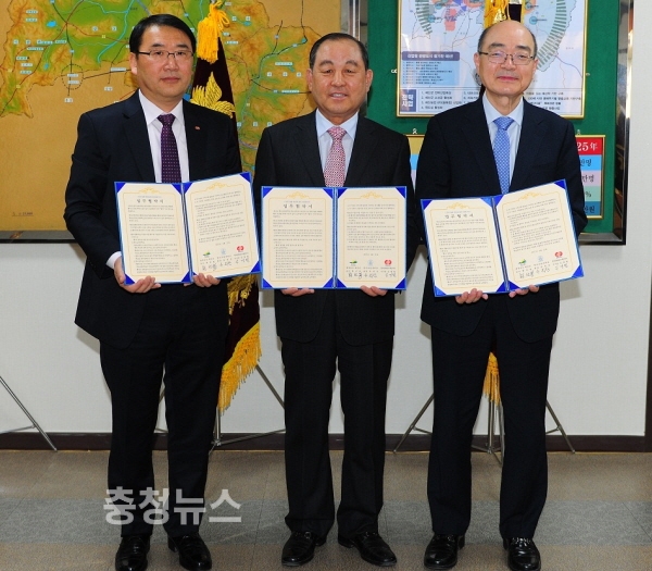 예산군과 한국교원대학교, 한국전력공사 예산지사가 황새를 보호하기 위한 업무협약을 체결하고 기념촬영