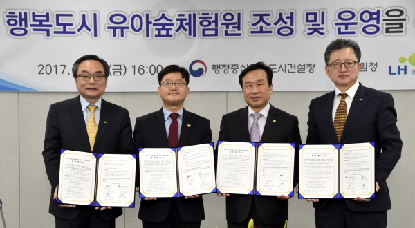 산림청(청장 신원섭)은 31일 행정중심복합도시건설청(청장 이충재), 한국산림복지진흥원(원장 윤영균), 한국토지주택공사(사장 박상우)와 행복도시건설청 종합상황실에서 ‘행복도시 유아숲체험원 조성 및 운영 활성화를 위한 업무협약’을 체결했다.
