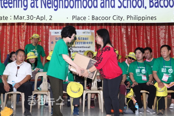 다음날인 3월 31일에는 필리핀 BACOOR시에서 선교봉사단체를 이끌고 있는 김상호 선교사와의 만남을 가진 뒤, 론고스 초등학교를 방문하여 21명의 학생에게 장학금을 전달하고, 학습기자재로 빔프로젝트를 기증하였다.