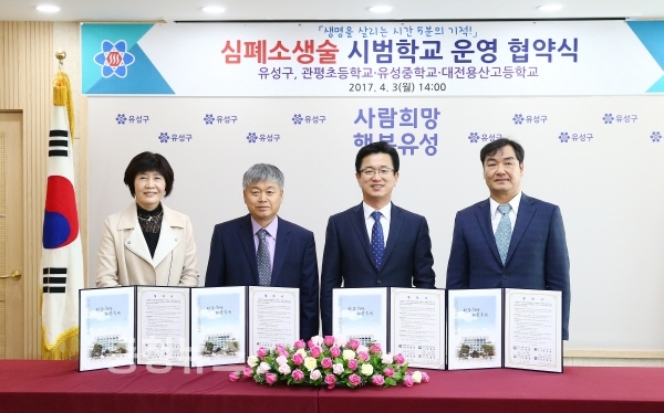 대전 유성구(구청장 허태정)는 심폐소생술교육 활성화 및 안전하고 건강한 학교문화 조성을 위해 관내 3개 초·중·고등학교와 3일 구청 중회의실에서 심폐소생술 시범학교 업무협약을 체결했다고 밝혔다.