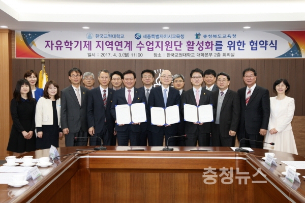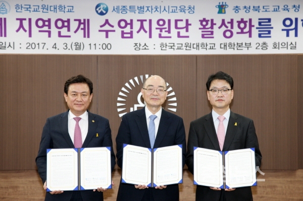 세종특별자치시교육청(교육감 최교진)이 지난 3일 한국교원대학교에서 한국교원대학교(총장 류희찬), 충청북도교육청과 자유학기제 지역연계 수업지원 활성화를 위한 업무협약을 체결했다.