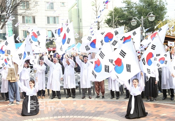 4일 오후 “대한민국만세” 소리가 대전 유성장터에 메아리로 울려 퍼졌다. 이날 지역 주민 등 500여명이 참여해 1919년 당시 독립만세 운동의 주역이었던 순국선열들의 애국정신을 이어받아 만세운동을 생생하게 재연했다.