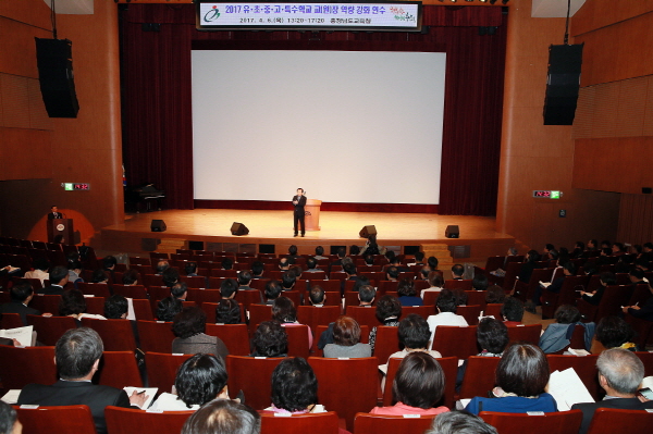 충남도교육청(교육감 김지철)은 학교관리자의 특수교육 및 학교 급식 안전에 관한 역량을 강화하기 위해 6일 충남도청 문예회관에서 유․초․중․고․특수학교 교장, 교감 500여명이 참석한 가운데 통합교육 및 식중독 예방교육을 실시했다.