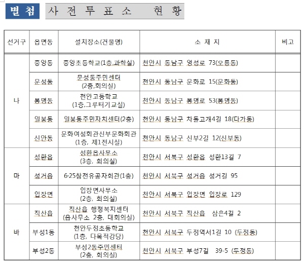 천안시 사전투표소의 위치 및 선거인 등재 여부 등은 천안시 홈페이지(www.cheonan.go.kr)에서 확인할 수 있다.