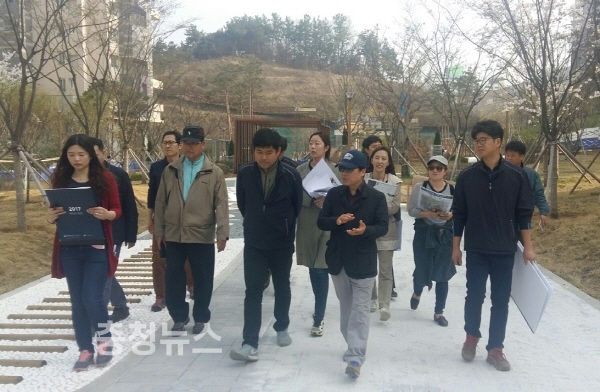 이충재 행복청장이 8일 새롬동(2-2생활권) 공동주택단지 및 주변 공원 등 현장을 점검하고 있다.