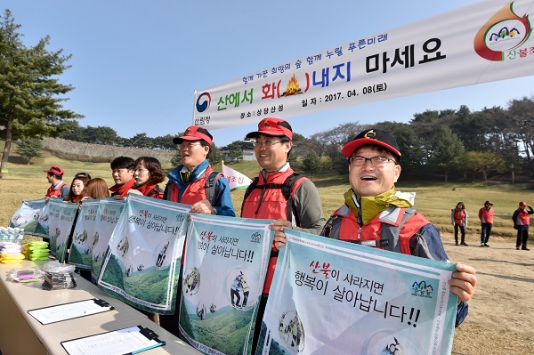 신원섭 산림청장(오른쪽 첫번째)이 8일 산림청 등산동호회 회원들과 함께 청주시 상당산성에서 등산객들에게 손수건 등 산불예방 홍보물을 나눠주며 산불예방 캠페인을 벌였다.
