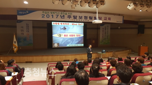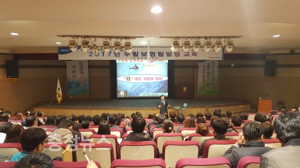 세종교육원 우성철 원장은 조합원 행복자산 보험추진 Mind-Up 강의를 통해 “우리나라가 고령화 사회에 이미 접어들었고, 저금리가 지속되고 있는 현재 행복자산 마련을 위해 보험을 추진하는 것은 조합원 행복시대를 여는 길이며, 황금 같은 주말시간을 이용해 교육받고 있는 여러분들이 있어 농협의 미래는 밝다.”고 강조했다.