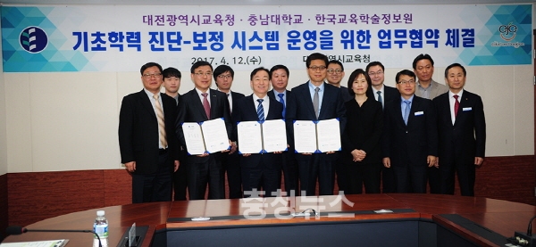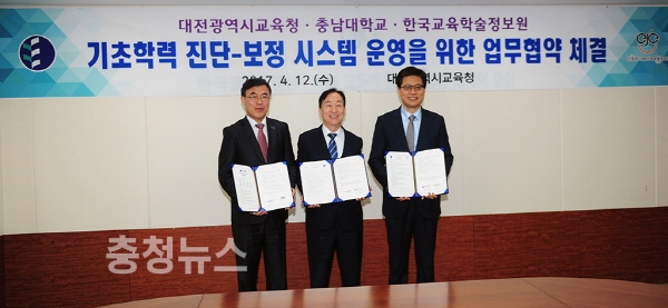 대전시교육청(교육감 설동호)은 12일 대전교육청 중회의실에서 충남대학교, 한국교육학술정보원과 「기초학력 진단-보정 시스템의 효율적인 운영을 위한 업무협약」을 체결했다.