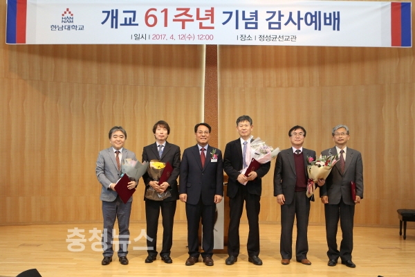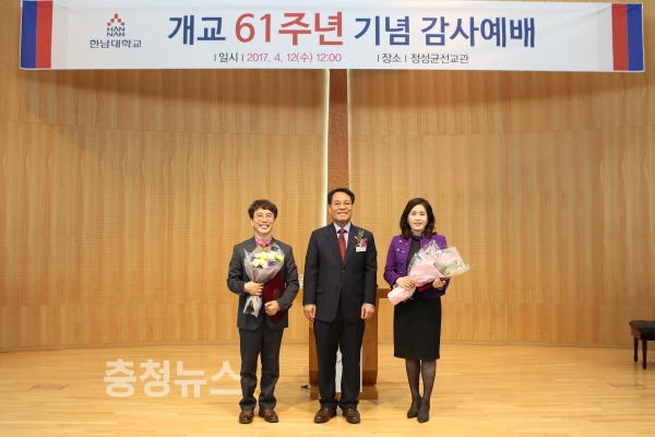 한남대(총장 이덕훈)는 12일 교내 정성균선교관에서 개교 61주년 기념식을 열고 연구업적·수업평가 우수교원 및 교직원 근속자, 업무유공자 등을 표창했다. 또한 모범직원 및 우수조교 포상, 미천장학회 장학금 전달 등의 시간을 가졌다.
