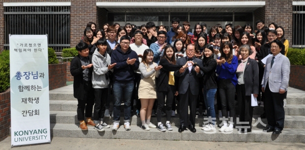 간담회를 마친 김희수 총장과 학생들이 함께 기념촬영을 하는 모습