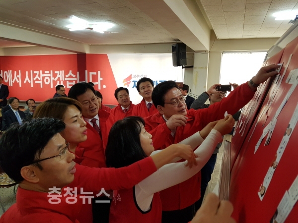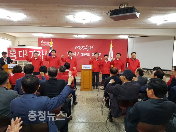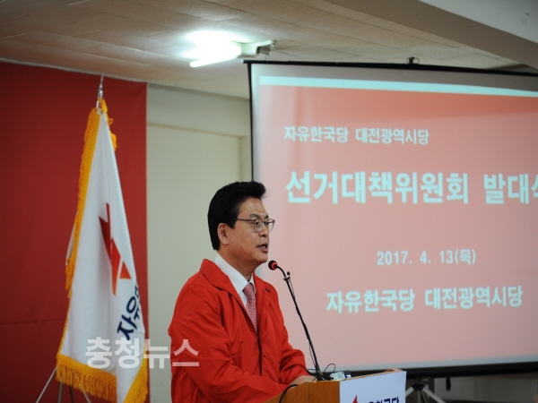 이날 선대위 발대식에서는 이은권(자유한국당 대전시당위원장)·정용기·이장우 국회의원과 이재선·이영규·진동규·이현 당협위원장 등 7명을 공동선거대책위원장으로 임명하고 박성효 전 대전시장을 국가대개혁위원장에, 신균 전 충남대 연대장을 국가안보위원장에 임명했다.