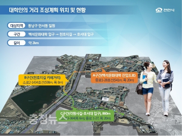 이에 따라 시는 백석문화대학입구~천호지길~호서대입구를 3구간으로 나누어 대학생들의 문화를 살릴 거리를 조성하겠다는 구상이다.
