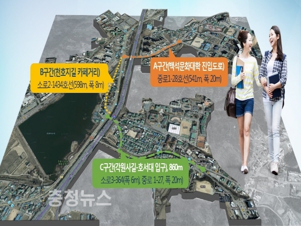 △길이 541m, 폭 20m 중로1-28호선의 백석문화대학 진입도로는 A구간 △길이 598m, 폭 8m 소로2-1434호선의 천호지길 카페거리는 B구간 △길이 860m, 폭 6m~20m 소로3-364호선의 각원사길-호서대 입구는 C구간으로 나눠 개선할 예정이다.