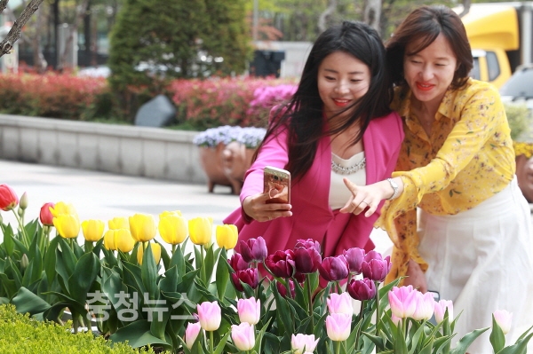대전 서구청 광장에 형형색색의 아름다운 튤립 1만여 송이가 만개해 구청을 찾는 민원인과 구민들의 눈길을 사로잡고 있다.