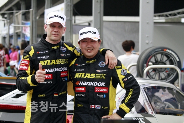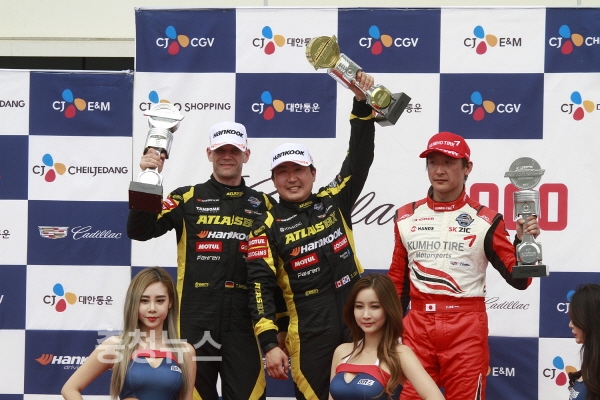 한국타이어(대표이사 서승화)가 후원하는 ‘아트라스BX 레이싱팀’의 조항우 선수와 팀 베르그마이스터 선수가 지난 16일 용인 스피드웨이에서 열린 2017 CJ대한통운 슈퍼레이스 챔피언십 Cadillac 6000 클래스 개막전에서 1, 2위에 오르는 원투피니쉬를 기록하며 우승을 차지했다.