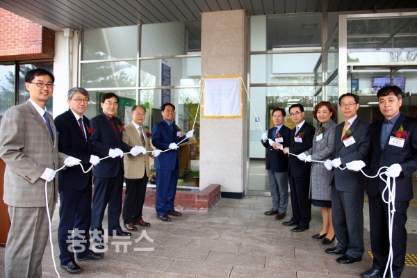 한남대 이덕훈 총장(중앙 좌측)과 한국산업인력공단 김인곤 이사(중앙 우측) 등이 IPP형 일학습병행제 듀얼공동훈련센터 현판을 제막하고 있다
