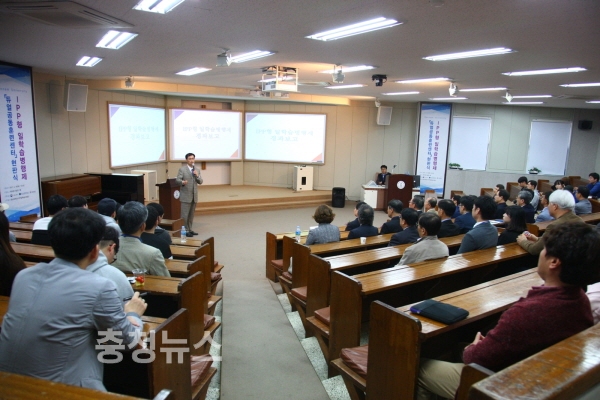 한남대 IPP일학습사업단 윤영선 단장이 듀얼공동훈련센터 현판식에서 경과보고를 하고 있다.