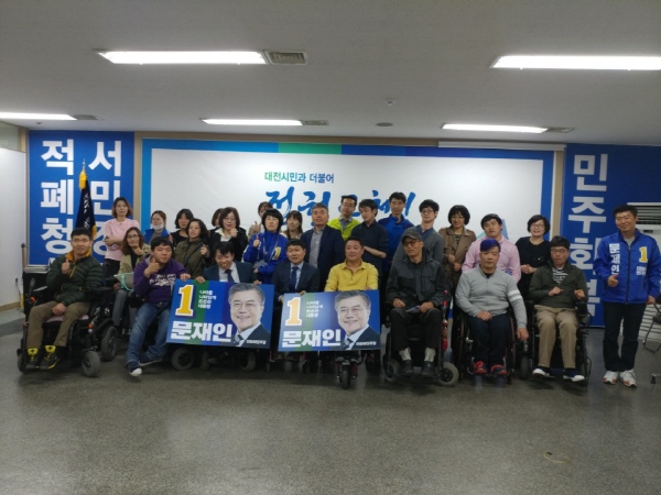 대전시의회 구미경 의원(비례대표, 더불어민주당)은 18일 대전 더불어민주당 회의실에서 19대 대선후보의 장애인 정책에 대한 토론회를 개최하고, 참석자들과 함께 문재인 후보 지지를 선언했다.