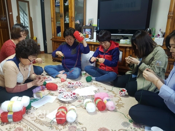 장항읍행정복지센터(읍장 최창근)는 어버이날을 맞이하여 새마을부녀회와 장항읍지역사회보장협의체가 한뜻으로 독거노인 어르신들께 전달하기 위하여 손뜨개 카네이션을 한 땀 한 땀 손으로 직접 만들고 있다.