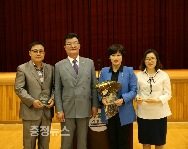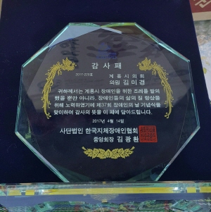 이날 열린 장애인의 날 행사에서는 김미경 의원이 '계룡시 장애인 등의 편의시설 설치 사전점검 조례'를 제정한 공로를 인정받아 (사)지체장애인 중앙회장으로부터 감사패를 전달받았다.