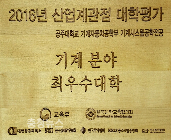 공주대학교(총장 직무대리 김희수)는 공과대학 기계자동차공학부 기계시스템공학전공이 ‘2016년 산업계관점 대학평가’ 기계 분야에서 ‘최우수 대학'으로 선정됐다고 20일 밝혔다.
