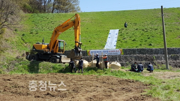 훈련은 여름철 태풍 북상에 따른 200㎜이상의 집중호우로 인해 저수지의 물넘이 배제능력을 초과하는 홍수로 저수지 제당유실 및 하류사면 일부가 붕괴되는 상황을 가상으로 설정해 실시됐다.