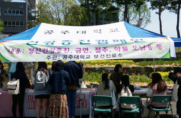특히, 이날 공주대 보건진료소는 건강생활실천에 대한 학생들의 인식확산과 자발적인 실천을 도모하고 건강증진 친화 환경을 조성하는 등 공주시 정신건강증진센터의 협조로 캠페인 행사를 실시하여 위기 학생에 대하여는 교내 정신건강의학과 전문의 상담을 받도록 안내했다.