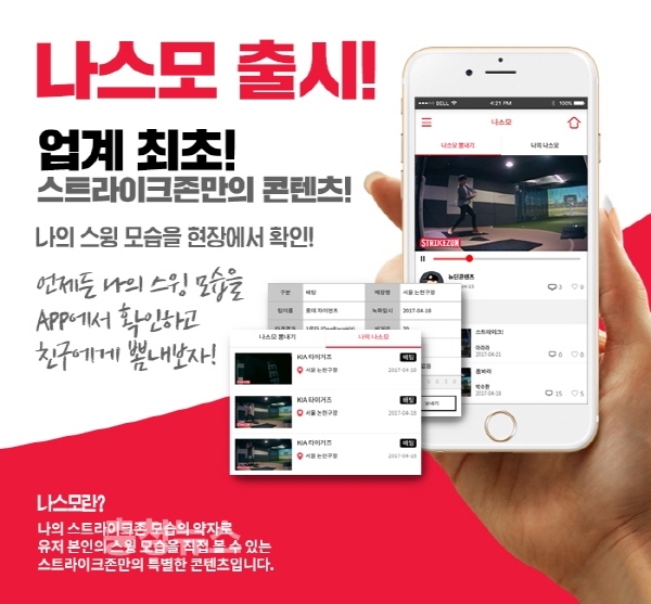 ㈜뉴딘콘텐츠(대표이사 김효겸)가 운영하는 스크린 야구장 브랜드 스트라이크존은 업계 최초로 모바일 어플리케이션을 통해 자신이 스크린 야구를 즐기는 모습을 저장할 수 있는 신개념 서비스 ‘나스모’ 기능을 실시한다고 25일 밝혔다.
