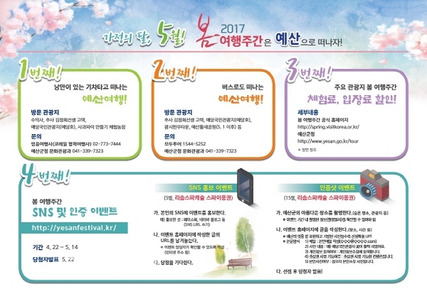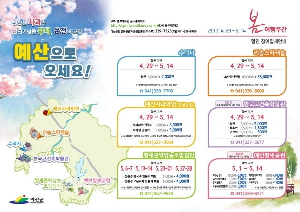 충남 예산군은 오는 29일부터 5월 14일까지 ‘2017 봄 여행주간’을 맞아 관내 주요관광지 입장료 및 체험료 할인과 SNS 이벤트 등을 진행할 예정이라고 26일 밝혔다.