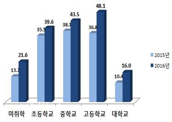 또한, 사교육비의 경우 2015년에 비해 전반적으로 지출금액이 모두 증가한 것으로 나타났으며, 특히 고등학교의 경우 11만 3천원 증가해 가장 많이 증가한 것으로 나타났다.