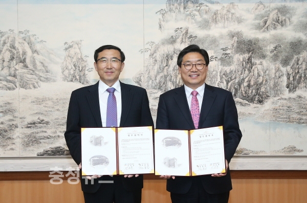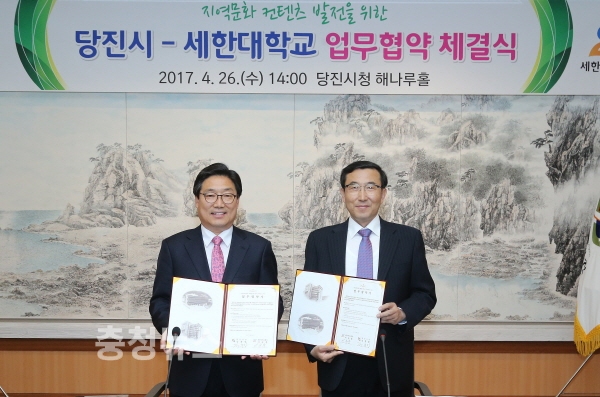 충남 당진시 김홍장 시장과 세한대학교 이승훈 총장이 26일 당진시청에서 지역문화 콘텐츠 개발을 위한 관·학 거버넌스 업무협약을 체결했다고 밝혔다.