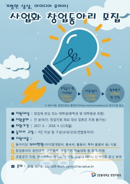 한밭대는 창업지원단 주관으로 ‘2017년 한밭대 창업지원단 사업화 창업동아리 발굴·육성프로그램’을 공고하고 5월 11일까지 프로그램에 참여할 창업동아리의 신청을 받는다.
