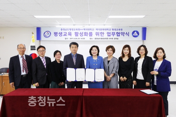 백석대학교(총장 최갑종)ㆍ백석문화대학교(총장 장종현) 평생교육원은 26일 충청남도평생교육원(원장 조융호)과 교육협력 사업 발굴, 평생학습 문화 확산 등을 목적으로 ‘평생교육 활성화를 위한 업무협약’을 체결했다.