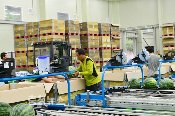 충남 논산시농업기술센터(소장 이재식)는 논산수박연구회영농조합(대표 이정구)에서 운영하고 있는 APC(농산물산지유통센터)에서 비파괴 당도선별기를 이용한 ‘예스민 논산수박’이 이마트, 가락동 농수산물시장 등으로 지난 25일부터 본격적인 출하를 시작했다고 밝혔다.