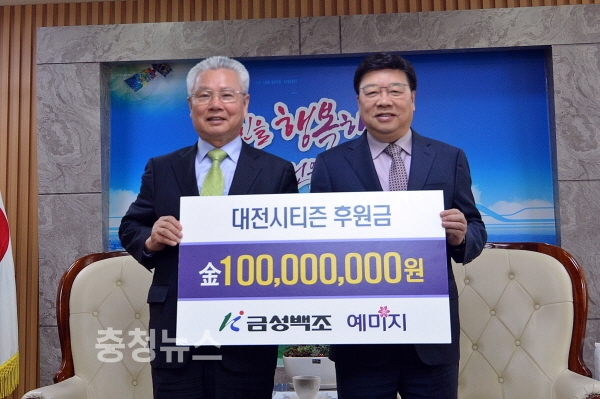 ㈜금성백조주택(회장 정성욱)이 올 시즌에도 대전시티즌의 선전을 기원하는 후원금 1억 원을 전달하였다.