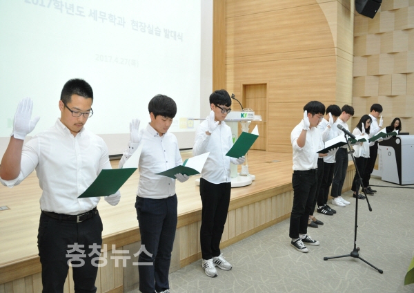 27일 저녁 건양대 논산 창의융합캠퍼스에서 세무학과 교수와 학생들이 세무서 현장실습을 나가기 앞서 발대식을 개최했다. 학생들이 현장실습을 통해 좋은 세무전문가가 되겠다고 선서하는 모습.