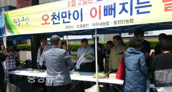 이번 행사는 천안시와 천안시농협조합공동법인이 공동으로 지역 대표 농특산물인 하늘그린 천안오이의 명품화와 소비촉진을 위해 마련됐다.