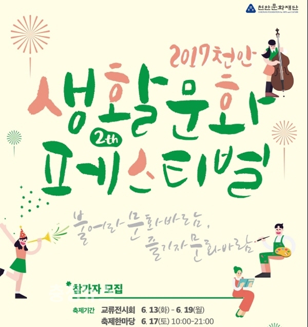 (재)천안문화재단(이사장 구본영)은 ‘2017 천안생활문화페스티벌’에 참가할 생활문화 동호회를 모집한다.
