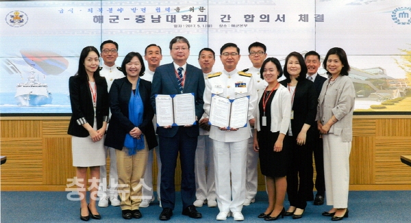 충남대 생활과학대학 김재한 학장과 신승민 해군본부 군수참모부장(준장) 등 양 기관 관계자들은  1일 계룡대 해군본부에서 ‘해군 장병 급식.피복 발전’을 위한 양해각서를 체결했다.