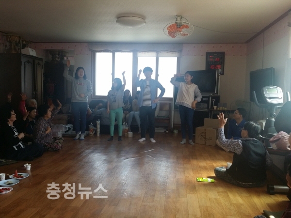학생들은 정성껏 준비한 떡과 과일, 음료수를 대접해드리고 준비해온 장기자랑 및 어르신들과 함께 치매 예방체조를 실시하여 조용한 시골마을의 어르신들에게 큰 기쁨을 선사했다.