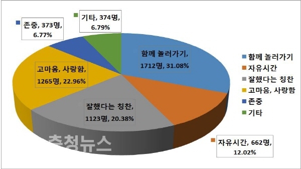 충남도교육청(교육감 김지철)이 도내 초등학교 3~6학년 학생들을 대상으로 설문조사를 실시한 결과, 초등학생들은 “함께 놀러가자”(31%), “사랑한다”(23%), “잘했다”(20.4%) 순으로 부모에게 말을 듣고 싶어 하는 것으로 나타났다.
