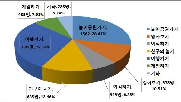 이 조사결과는 초등학생들이 어린이날 하고 싶은 일과 바로 연결이 된다. 응답 학생들은 어린이날 여행가기(29.13%), 놀이공원가기(28.35%) 등 50%가 넘게 놀러가는 것을 원했기 때문이다.