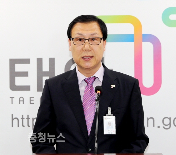 <사진설명> 지난 2007년 발생한 기름유출사고의 아픔을 극복하고 청정 관광지의 옛 모습을 회복한 태안군이 기름유출사고 10주년을 맞아 전국 123만 자원봉사자와 함께 하는 ‘희망 나눔 한마당’ 행사를 통해 희망의 성지로 우뚝 선다. 사진은 정례브리핑 중인 맹천호 유류피해대책지원과장.