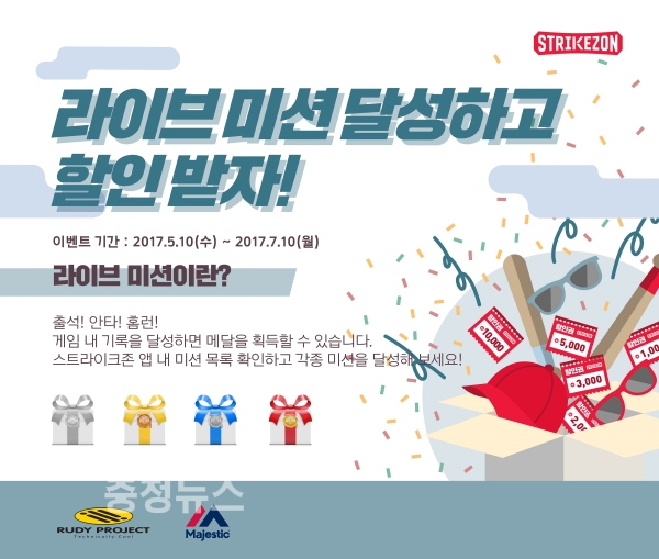 특히 이번 ‘라이브 미션’ 이벤트에서는 2017년 WBC 유니폼 공식 후원사였던 마제스틱의 KBO구단 모자와 스포츠 글라스 전문 업체인 루디 프로젝트의 선글라스 등 양질의 야구 용품을 경품으로 지급하며 야구 마니아들의 승부욕을 자극하고, 새로운 재미를 더할 것으로 기대된다.