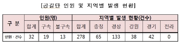 특히 충남청 광역수사대에서는 3대반칙 행위근절 기간(2. 7. ~5. 17.) 중 주로 경상도에서 활동하는 경상도 자해공갈단 조직 14명을 검거하여 이중 7명을 구속하였다.