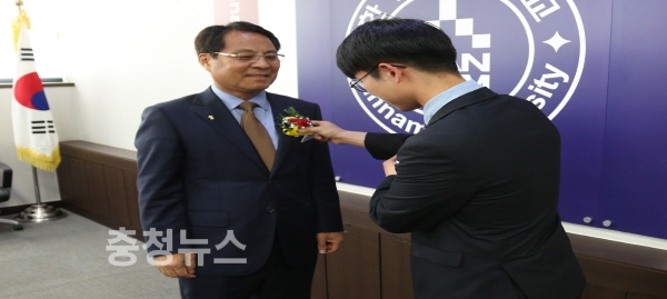 이날 다니엘장학생 대표로 김세연 학생(교육학과 4년)이 이 총장에게 스승의 날 카네이션을 달아드리며 감사의 마음을 표했다.