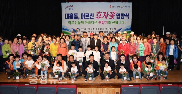대전 중구 대흥동주민센터(동장 이재근)와 복지만두레(회장 이우철)는 16일 중구문화원에서 자녀가 없거나 자녀가 있어도 자주 찾아뵙지 못해 외로움을 느낄 수 있는 어르신 100여 명을 초청하고 ‘효자꽃 입양식’을 가졌다.