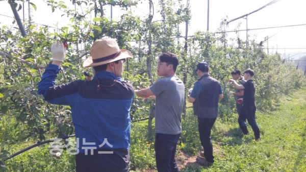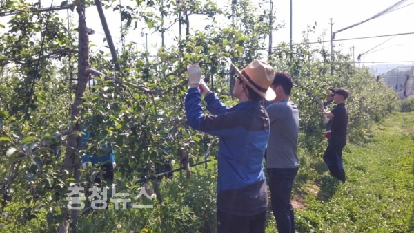 이날 면 직원 10여명은 바쁜 업무를 잠시 접어두고 이른 아침부터 관내 과수농가를 방문해 농가의 부담이 없도록 식사와 작업준비물도 직접 준비한 가운데 사과나무 200여주에 대한 적과작업을 실시했다.