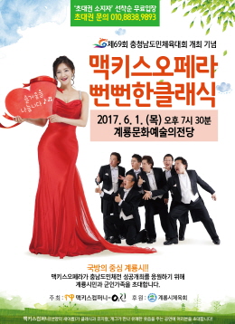 산소소주 O2린(오투린)을 생산하는 충청권 주류 대표기업 맥키스컴퍼니(옛 선양 / 회장 조웅래)가 호국보훈의 달인 6월 1일 오후 7시 30분 계룡문화예술의전당을 찾아 맥키스오페라 뻔뻔(funfun)한 클래식 ‘힐링음악회’를 연다. ‘초대권 소지자’ 선착순으로 입장되며 초대권은 미리 신청해 무료로 받을 수 있다.