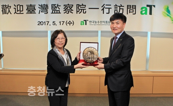 양메이링(楊美鈴, Ms. Yang, Mei-ling) 대만 제4기 감찰위원이 aT 백진석 식품수출이사에게 감사의 뜻으로 기념패를 전달하는 모습